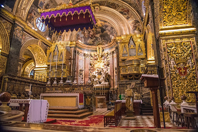 A parade and the beautiful cathedral in Valetta, the current capital city of Malta.